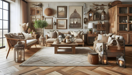 rustic chic decor, a stylish loft with wooden frames dried flowers, infusing an elegant autumn vibe balancing nature with sophistication