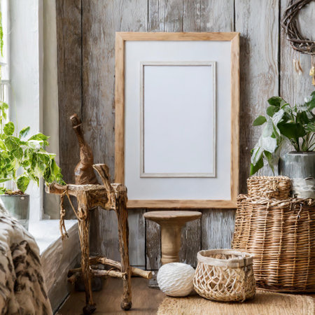 a rustic wicker basket picture frame leans casually against a distressed wooden wall, surrounded by lush greenery, evoking a sense of vintage charm and cozy farmhouse decor, perfect for showcasing cherished memories in a rustic country home or shabby chic inspired space. ai generated