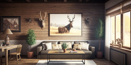 Frame mockup in empty in the living room, clean and modern design, versatile for showcasing artwork or photographs, minimalist aesthetic. AI Generated.