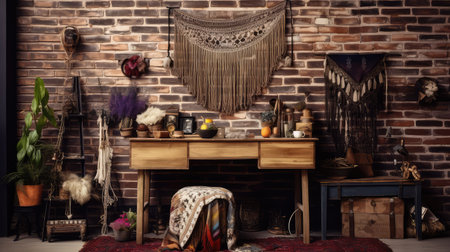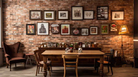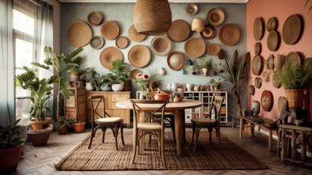 Interior design inspiration of Bohemian Eclectic style home dining room loveliness decorated with Wood and Textile material and Gallery Wall .Generative AI home interior design .