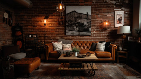 Living room decor, home interior design . Industrial Bohemian style with Brick Wall decorated with Metal and Leather material . Generative AI AIG26.