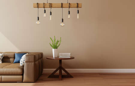 Empty wall. Minimalist interior decoration in warm tones, autumn and winter style. Sofa and wooden furniture.