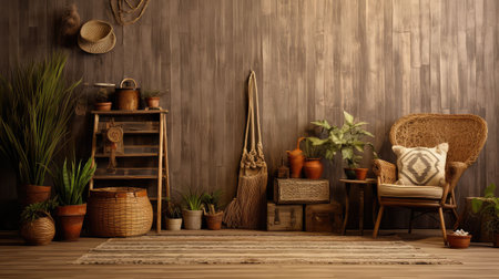 Bohemian style interior decor with potted plants and woven baskets on rustic table. That the image is generated using AI.