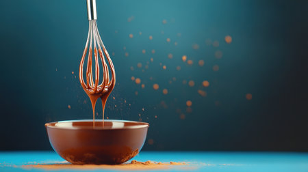This dynamic image captures the art of whisking a smooth chocolate mixture in a bowl, showcasing culinary textures and playful splashes against a bright blue background.