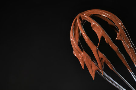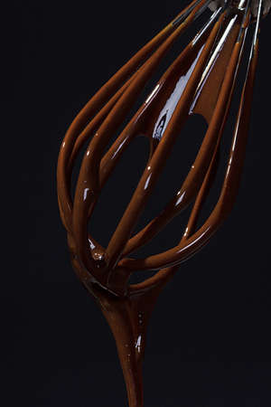 Chocolate is whipped with a whisk. Close-up of a wire whisk and melted chocolate on a black background.
