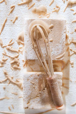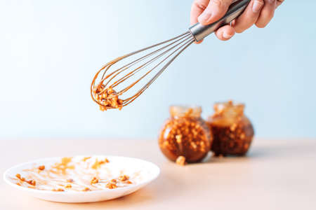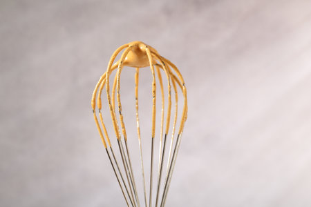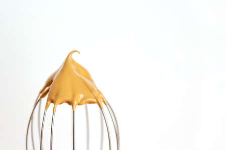 Close-up of coffe cream on metal whisk on light background for dalgona coffee. Copy space. Culinary whisk with brown cream.
