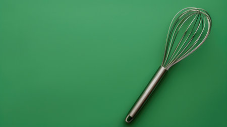 A sleek metal whisk lies on a textured surface adorned with fresh green droplets, exemplifying a modern kitchen aesthetic and culinary artistry.