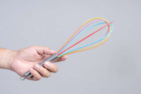 A man's hand holds a whisk isolated on white background. Kitchen tools for cooking.