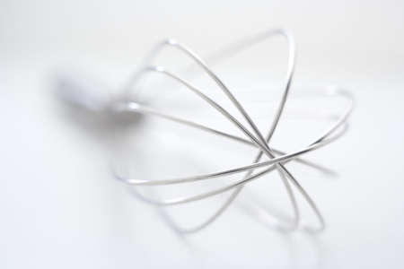 close-up of a metal kitchen whisk tip with very limited depht of field on a white background