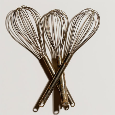 Three metal whisks arranged in a heart shape cast elegant shadows against a light background, perfect for culinary-related themes and kitchen decor.