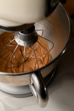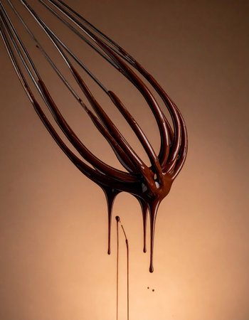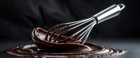 AI Generated. Chocolate Sauce Swirling in a Metal Whisk on a Dark Background