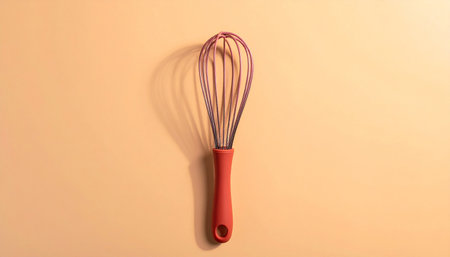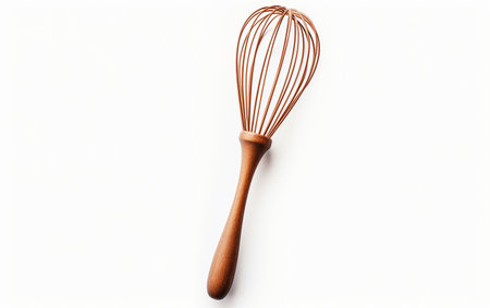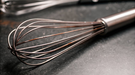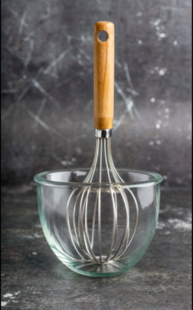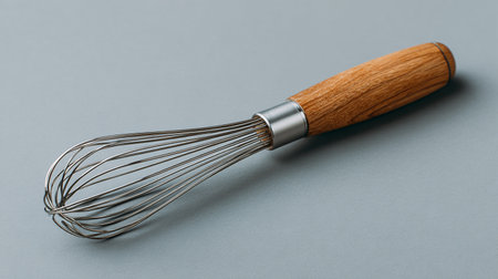 This image features a sleek stainless steel whisk with a wooden handle, showcasing elegant design and dynamic shadows on a minimalist background, perfect for culinary projects.