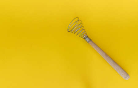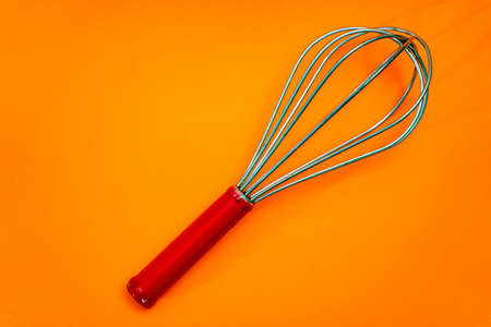 Metal rod whisk with wooden handle insulated on orange background. Kitchen utensils.