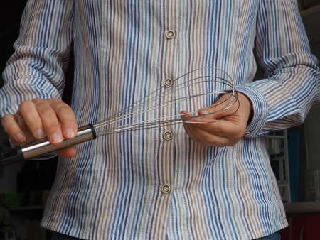 Women's hands hold a metal whisk for whipping or kneading. Kitchen and cooking utensils, dishes. A woman in a white striped shirt stands in the kitchen and shows a whisk.