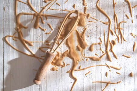 Metal whisk for whipping on a wooden large spoon on a dark coating stained with flour. Baking at home