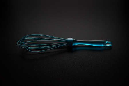 Manual hand mixer for blending, beating, Egg beater isolated on metal background. Metal stainless steel kitcenware utensil