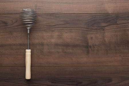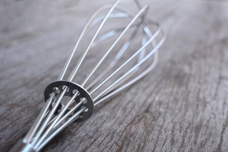 Beater for whipping from stainless steel on a wooden table.Kitchen.