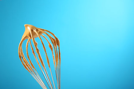 Making delicious dalgona coffee. Whisk with cream on light blue background, closeup. Space for text