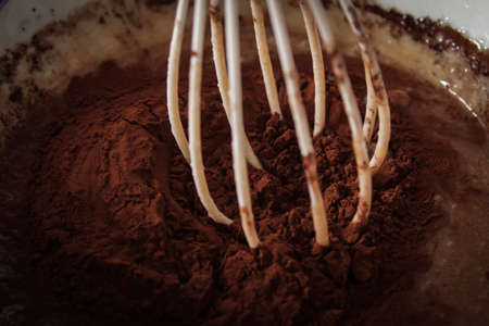 mixing dough for chocolate cake in a bowl. female hands and a kitchen whisk. recipe step by step