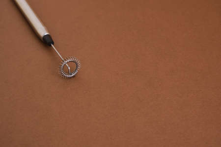 metal handheld milk steamer on brown background. Handheld frother or foam maker close up. copy space top view mock up