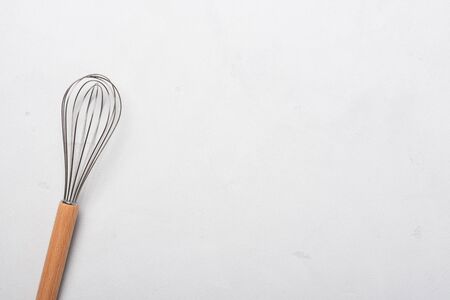 Whisk cooking egg beater mixer whisker with wooden handle on stucco table top view