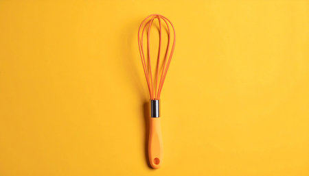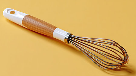 This stylish kitchen whisk features a wooden handle set against a vibrant yellow backdrop, perfect for adding a modern touch to cooking and baking activities.
