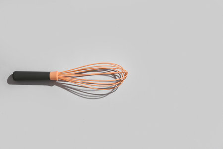 Single grey whisk at the top right of a plain pastel pink background - kitchen utensil minimal composition