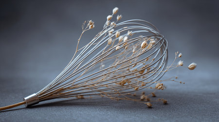 A hero detail shot focusing intensely on the intersection of a vintage metal whisk and a mound of fi