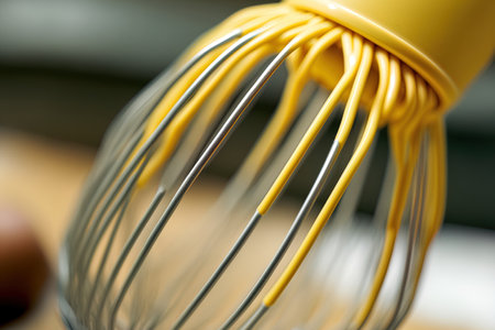 Stainless steel wire whisk stirs fresh flour generated by artificial intelligence