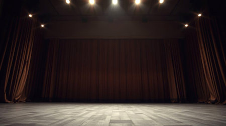 Theater stage with red curtains and spotlights, dramatic lighting.