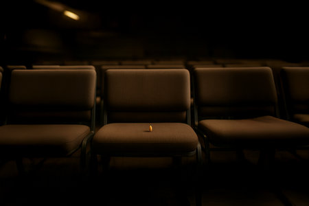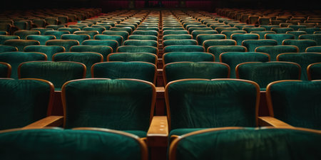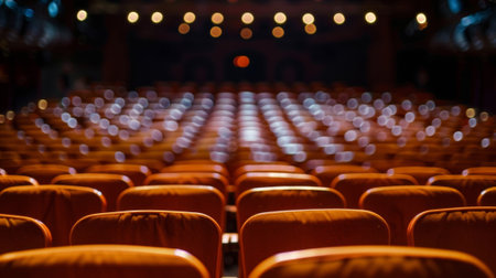 Empty theater with clean, plush seats aligned in rows, dimly lit by ambient lights a peaceful, quiet atmosphere