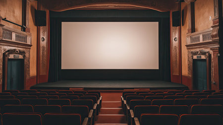 Warm ambiance of a vintage cinema hall with plush red seats and an inviting blank screen, waiting for a movie to start.