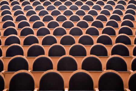 Empty chairs in the assembly hall are arranged in rows, top view