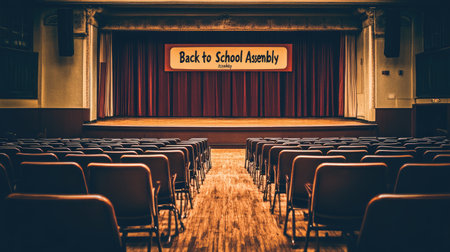 Welcome to a vibrant back to school assembly in a historic auditorium, featuring empty seats and a colorful banner, perfect for educational events and gatherings.