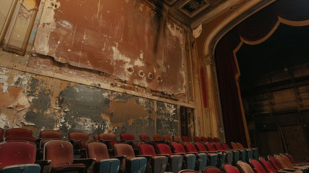 Rows of empty seats in an abandoned theater.