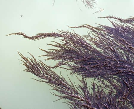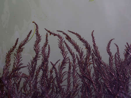 Curving fronds of purple red seaweed growing on the surface of still seawater
