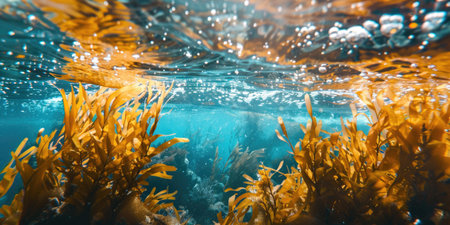 A stunning underwater view of a kelp forest, with sunlight filtering through the water, creating a beautiful and dynamic scene.