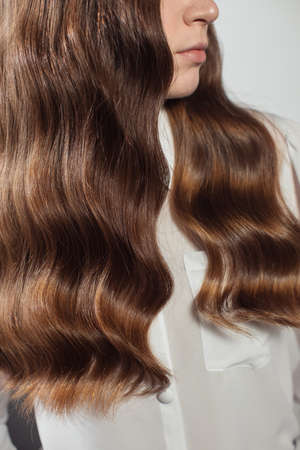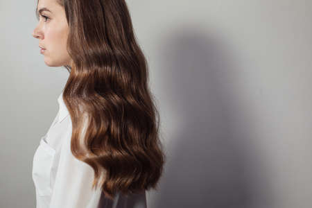 Close-up of a woman long, wavy hair cascading over her shoulders, with a plain background providing room for copy space on the right.