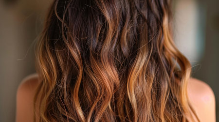 Long, wavy hair with blend of brown and blonde highlights creates beautiful, natural look. soft waves add texture and movement, enhancing overall appearance
