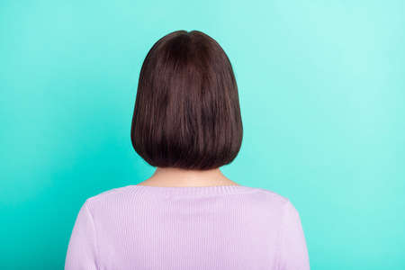Back rear view photo of young woman spine haircare haircut salon treatment conditioner isolated over teal color background