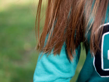 Close up portrait of pretty redhead girl with long wavy hair blowing on the wind.