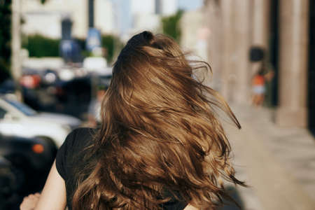 Young woman with flowing hair walking on a city street. concept of urban lifestyle, movement, freedom.