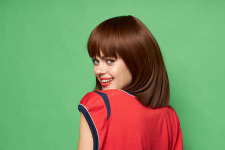 Shoulders shot of red haired lady in summer dress, joyful summertime