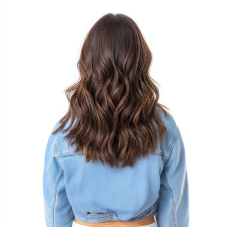 This image features a stylish woman with long, wavy brown hair cascading down her back, dressed in a casual denim jacket, showcasing elegance and beauty.