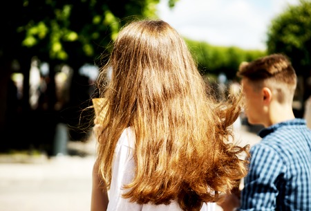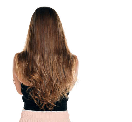 Back view of young woman in white shirt with long beautiful shiny hear.