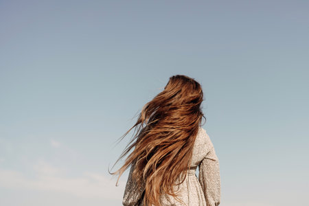 Close-up view of a womans long, wavy hair blowing in the wind, showcasing hair care and style.
