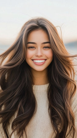 Stunning close-up of a young woman showcasing her long, flowing hair and enchanting expression, beautifully lit by natural light to highlight her features.