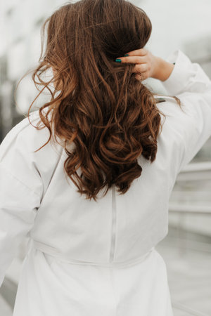 A stunning back view of a woman with long wavy hair showcased in natural light, wearing a white sweater. This image captures the essence of beauty and elegance in a relaxed setting.