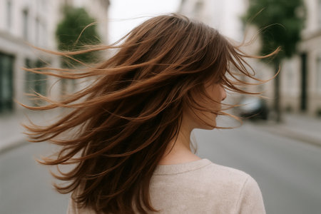 A woman stands with her hair blowing in the wind, showing a dynamic and stylish look.