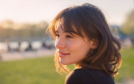 Captivating portrait of a young woman with long hair enjoying the warm glow of sunset, radiating natural beauty and confidence in a tranquil outdoor setting.